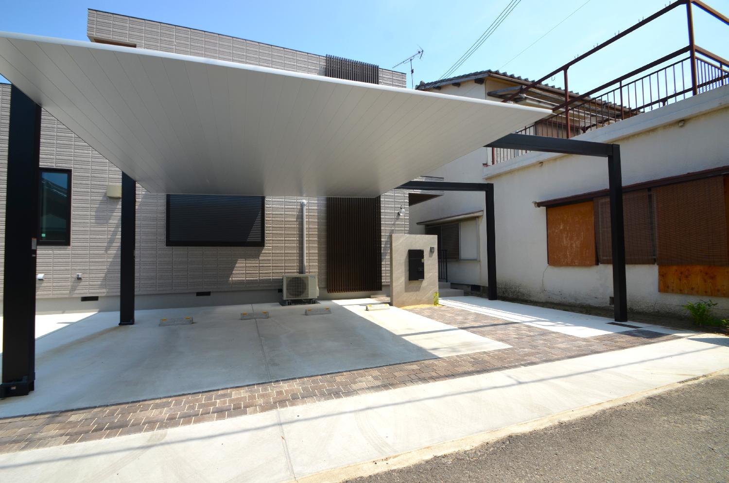 カーポートを主役にしつつ、玄関までの動線を魅せるため、アプローチを広めに入れました。